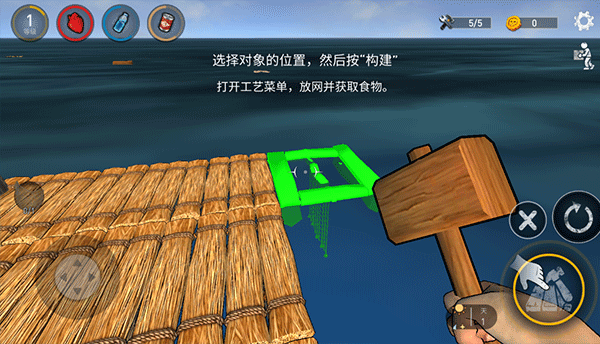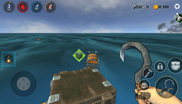 3、在木筏和水域中移动时,需借助操纵杆来完成操作。转动左侧操纵杆,对准漂浮在水面的木箱或其他可收集资源,随后点击右侧的钩子,即可将这些资源拖拽至木筏之上。1在这片无垠的水域中,生存的关键在于巧妙利用身边的一切。基础的果腹之物多取自水中生灵,只要掌握恰当的处理方式,便不必担忧饥饿的威胁。咸涩的海水可经净化饮用,水中的游鱼能通过垂钓获取,随着探索的深入,还能培育各类植物,为自己开辟稳定的食物供给渠道。