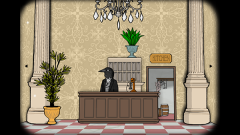 22、首先乌鸦先生前台这里,背后的钥匙存放处房间1的钥匙出现了,拿走。