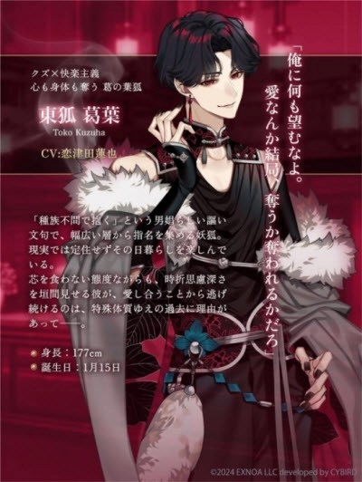 东狐葛叶(とうこ くずは)的声优是恋津田莲也。温柔而又带着一丝狡黠的声音,完美诠释了这个角色的特质。