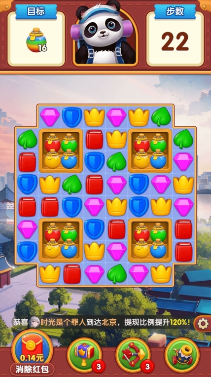 《熊猫爱旅行》是一款旅行主题的三消游戏。玩家将化身可爱的熊猫,怀揣旅行计划前往各地城市游玩。通过闯过三消关卡赚取旅行资金,就能购买机票、预订酒店、兑换景点门票,一步步完成旅行规划,还能收集当地特色美食与纪念好物。游戏画面简约清新,搭配轻快的背景音乐,更有海量关卡与实用道具供玩家体验。想要在关卡中拿到高分、赢取奖励,就得巧妙运用各类道具和策略。不仅如此,游戏里还有限时挑战、排行榜比拼等趣味活动,让整个游玩过程充满乐趣与挑战。