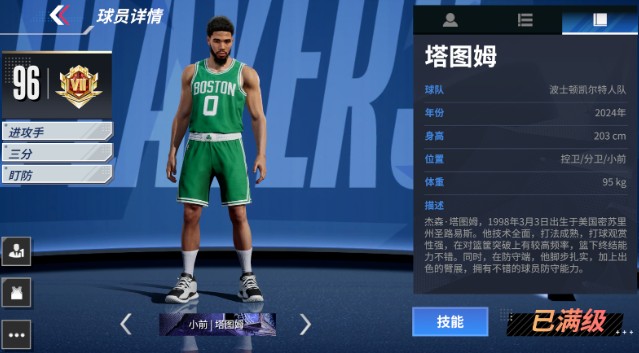 5、塔特姆,游戏中的塔图姆拥有丰富的进攻手段和专属撤步投篮动作,能突能投,是进攻中定点爆破的专家!