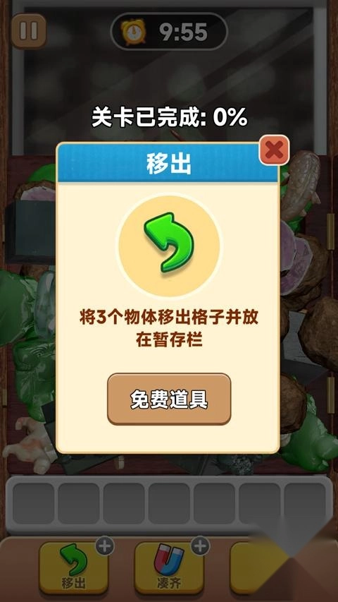 4、玩家能够借助道具来获得帮助,比如“移出”道具,它可以把3个物体从格子里移出去并放置在暂存栏中;