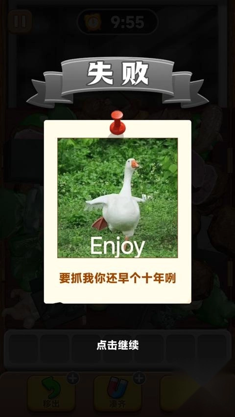 5、若未能在规定时间内成功消除所有物品,且被大鹅抓住,游戏即宣告失败。