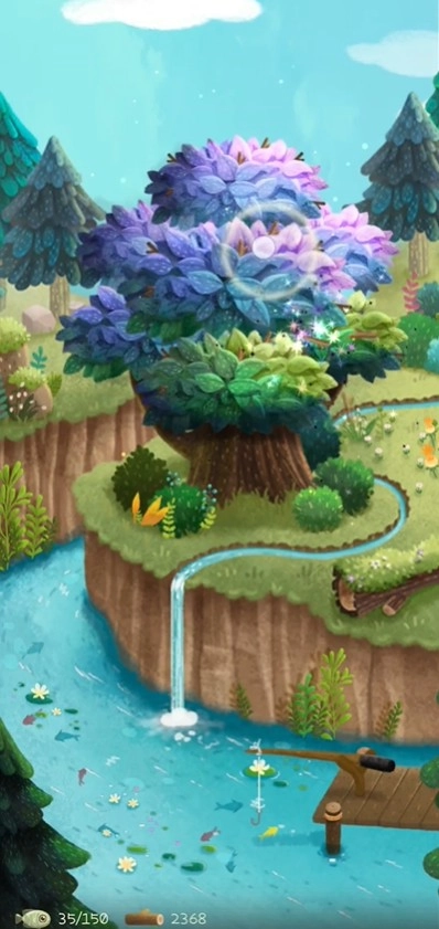 4、点击、滑动这颗树可以获得木材,点击河边的钓竿可以钓鱼,注意把控力度哦