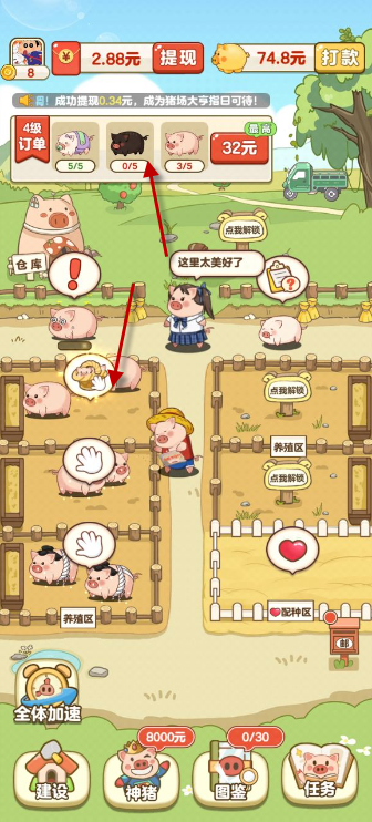 1、游戏的经营玩法较为简单,只需留意上方的订单详情,养殖对应的小猪就行。
