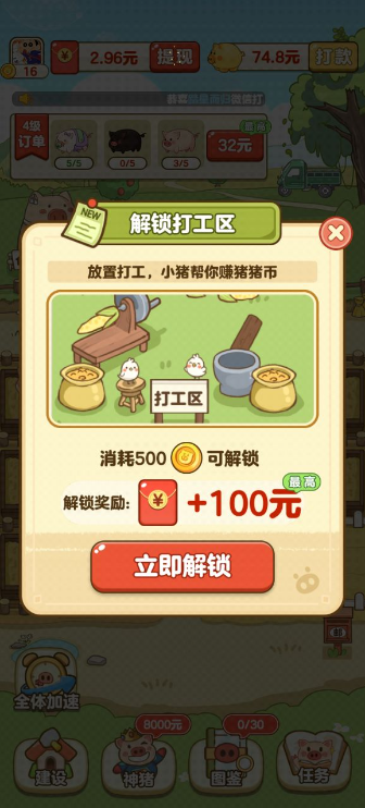 1、这是一款简单轻松的养殖小游戏,你可以养殖各类可爱的小猪猪去完成订单,而且支持挂机养殖,只需一键操作就能收取红包奖励!