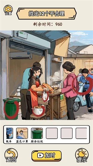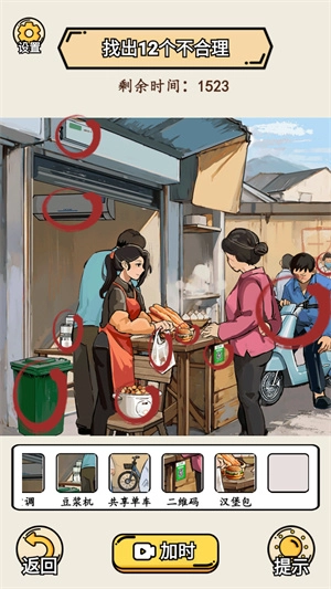 2、玩家需按照上方提示完成通关任务,以第一关为例,任务是找出12处不合理之处,核心在于识别那些与时代背景不符的物品。