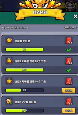 是可以到账的,不过玩家得完成一系列新手任务,像角色升级、收集资源、完成指定任务之类的都包含在内。等完成这些新手成就任务,玩家就能到账0.3了。但到账0.3之后,还得观看10个广告,这样才算走完整个流程。