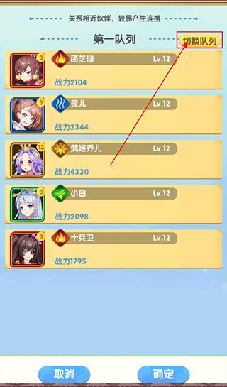 3、进入阵容页面之后可以看到每个英雄的战力,可以点击右上角的切换队列,就可以开始切换阵容啦!