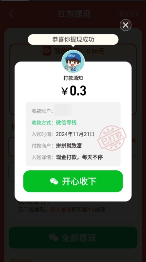 3、积累的红包都是真实有效的,只要凑齐了最低的0.3门槛就能提现,一直玩下去还能提高提现的比例,让收益更大!
