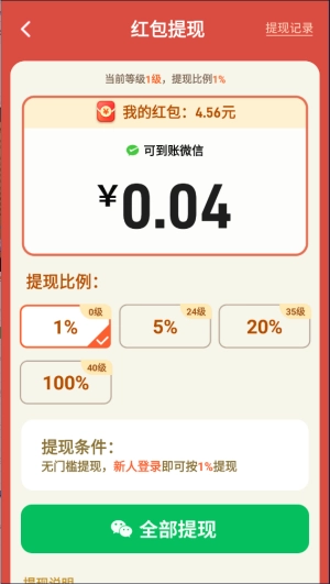 5、积累的红包是按照百分之一的比例计算提现的,比例可以通过你等级的提升而随之提升。