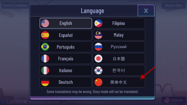 1、进入游戏后,先别急着进入主界面的游戏环节,初始状态下是英文模式,你可以点击右下角的“language”按钮。