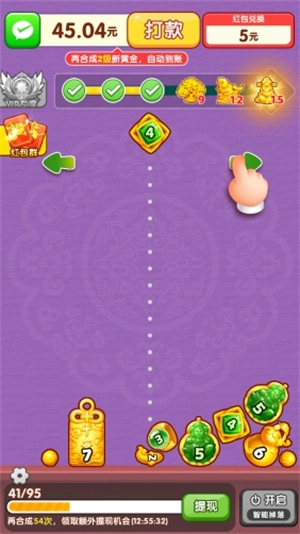 财运我最行主要采用合成玩法,玩家需快速将相同物品合成,以此解锁全新的高级物品,还能获取额外福利,千万别错过。而且当合成到一定等级的物品后,会解锁智能掉落功能,开启后物品会持续掉落,无需玩家进行操作。