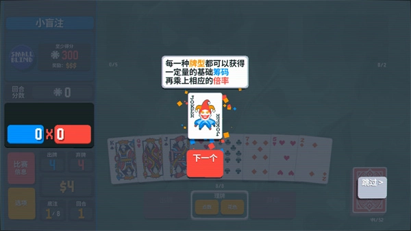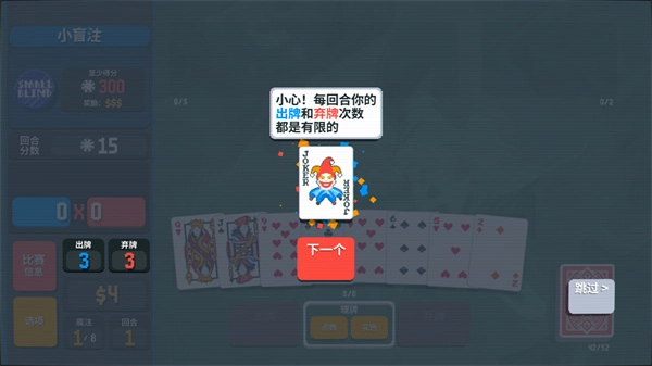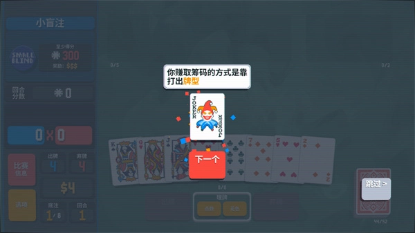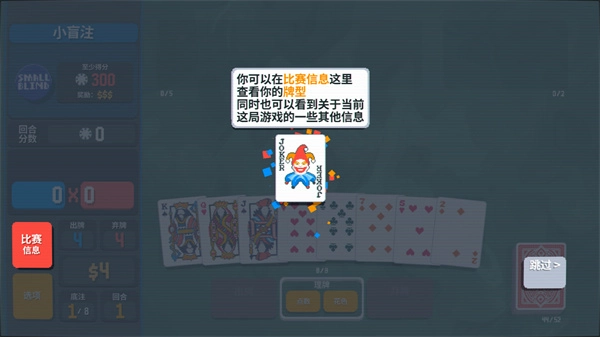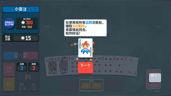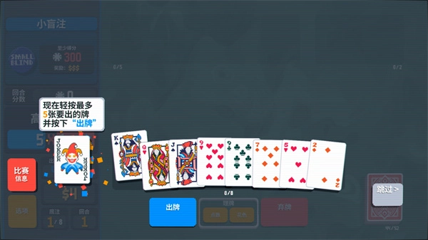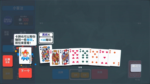 9、在耗尽所有出牌次数之前,赚取300筹码,即可赢得这一回合。