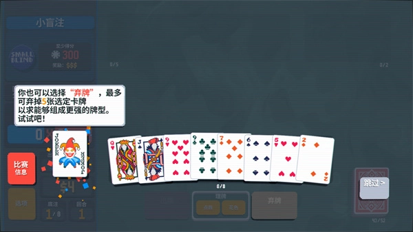 7、你也可以选择“弃牌”,最多能弃掉5张选中的卡牌,这样做是为了能组成更厉害的牌型。