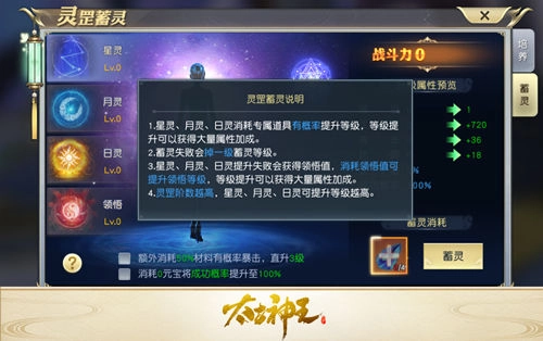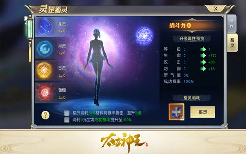 不过蓄灵和灵罡的修炼不同,它并不稳定,提升等级时存在失败的风险,一旦失败就会掉一级蓄灵等级,所以玩家在修炼到高级后,是否要继续提升得慎重考虑。好在不管是日灵、月灵还是星灵,蓄灵失败后都会增加领悟值,而消耗领悟值能提升第四类法门“领悟”的等级,这样即便运气很差,蓄灵连续失败,也能为灵罡带来稳定的提升。
