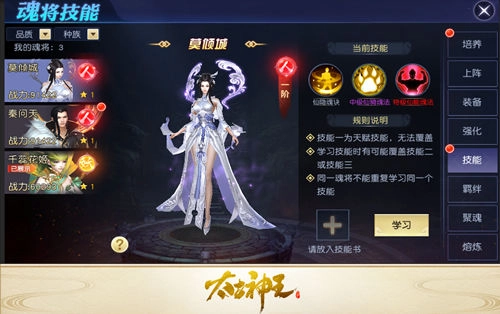 魂将技能玩法是后天培养的内容,当玩家等级达到超凡100级时解锁。该系统允许玩家为魂将自由配置指定技能,不受品质或专属条件的约束,哪怕是同一位魂将,也能打造出多种不同的助战风格。目前魂将设有3个技能空位,其中天赋技能会默认占用1个,剩余的2个空位,玩家可以借助特殊技能书“魂法”来配置后天技能,从而让魂将获得相应的增益效果。