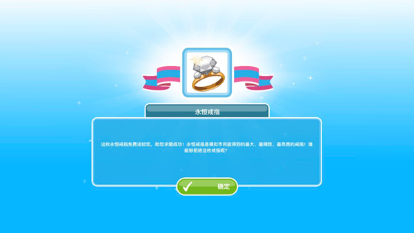 ②求婚戒指:在赠送玫瑰之后,下一步需要送出求婚戒指。玩家无需前往商店进行购买,系统会免费提供一枚戒指。