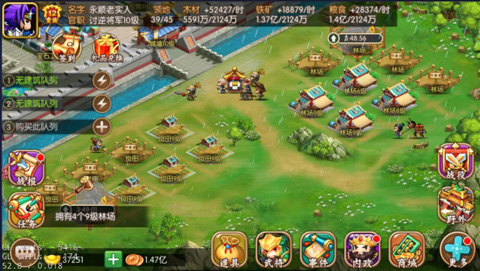 4、提升主城内良田、铁矿与林场的等级,城内这些资源地会对资源产出形成百分比加成,再搭配上野外占领的土地,能让你的资源产量大幅增长。
