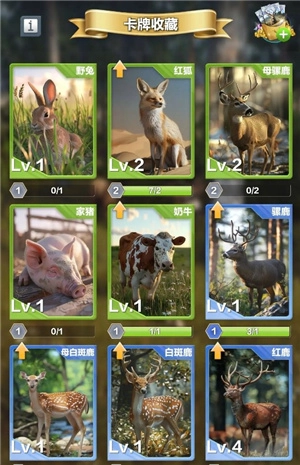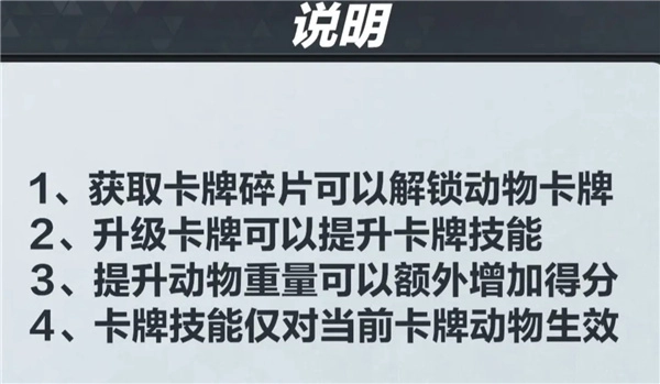 9、每次进行狩猎活动时,都有机会获得卡牌碎片,这些碎片可用于解锁动物卡牌。每张动物卡牌都具备独特的加成能力,通过升级卡牌能够增强其技能效果,从而在狩猎结束结算时为玩家带来更高的分数收益。需要特别留意的是,卡牌所附带的技能效果仅针对当前装备的卡牌对应的动物有效。
