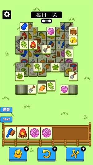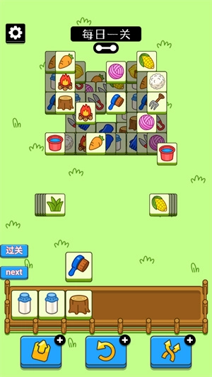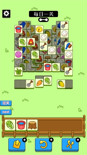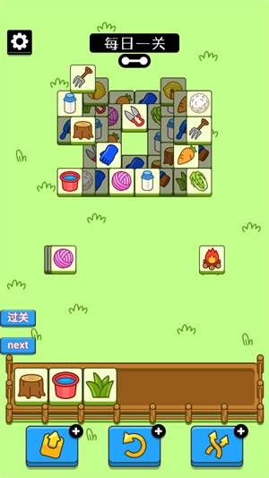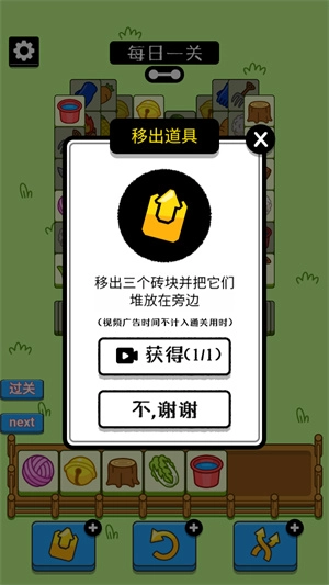1、进入关卡中,可以看到有很多的砖块,先去选择三个一样的,直接就能消除的。
