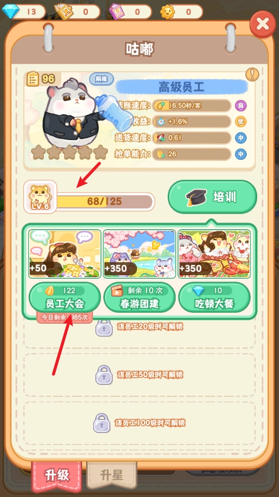 5、点击员工即可对其进行培训,提高它的等级。