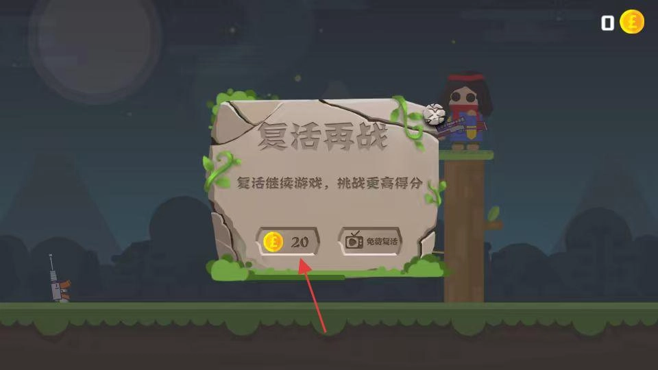 挑战失败后,屏幕会弹出复活再战的界面,提供两个选项:花费20金币即可复活,继续参与对决,朝着更高的得分目标前进,让狙击进程得以延续。