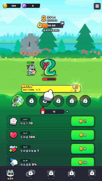 猫咪村庄,一款放置挂机类的休闲,游戏以可爱猫咪为主角,玩家将与能力各异的猫咪们组成小队,踏上消灭怪物之旅。游戏中每一只猫咪都有独特的立绘形象和技能属性,玩家需要合理的搭配阵容,才能应对逐渐变强的敌人。非常适合摸鱼休闲游玩的一款游戏,不需要复杂的操作就也可以享受不断升级的乐趣。