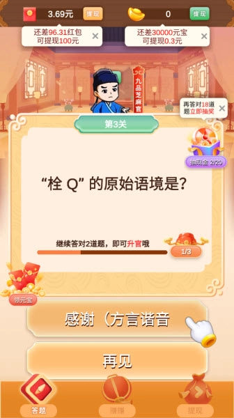 这是一款为答题闯关爱好者量身打造的游戏,操作虽简易却极具挑战性。随着关卡逐步深入,题目难度会不断提升,答对即可晋级,答错则会被淘汰,持续考验着玩家的能力边界!