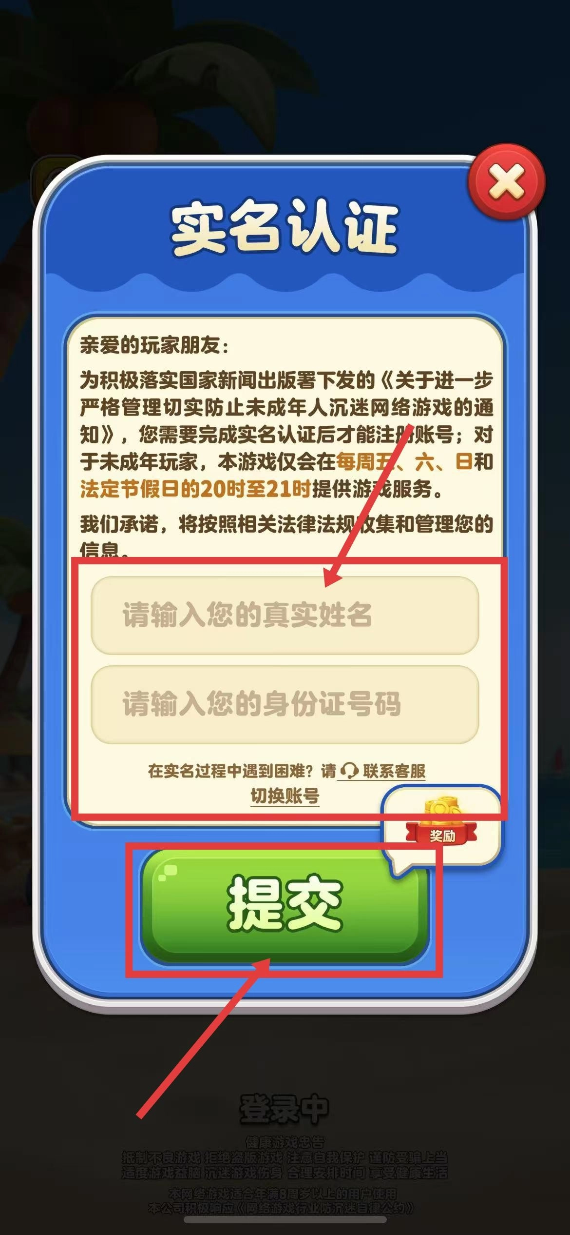 3、登录后进入实名认证页,需输入真实姓名、身份证号码,确认无误点击【提交】,完成认证后进入游戏。