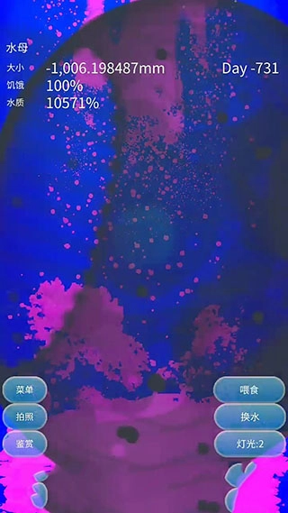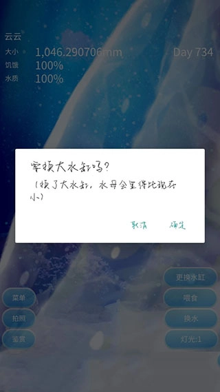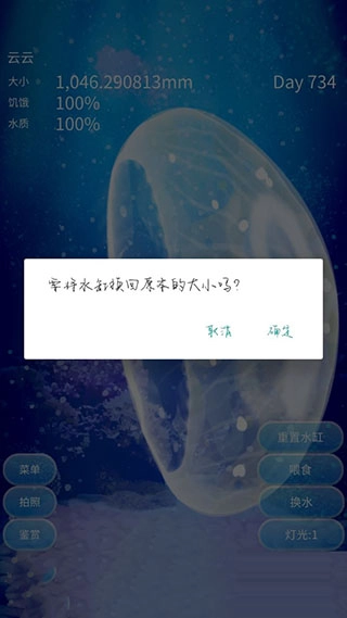 时间调到2019年后进行重置,喂足食物和水,再依次往后调整时间,终于把水母养得胖到转身都费劲。第二天游戏就提示需要更换大水缸,具体如图所示。