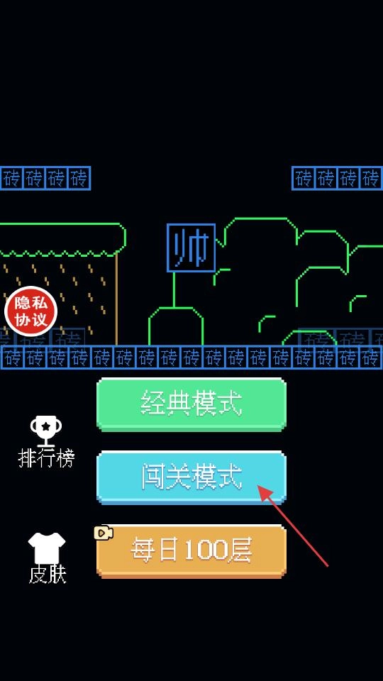 进入游戏主界面后,能看到经典模式、闯关模式、每日100层等选项,顺着红色箭头点击闯关模式,即可进入关卡选择环节。