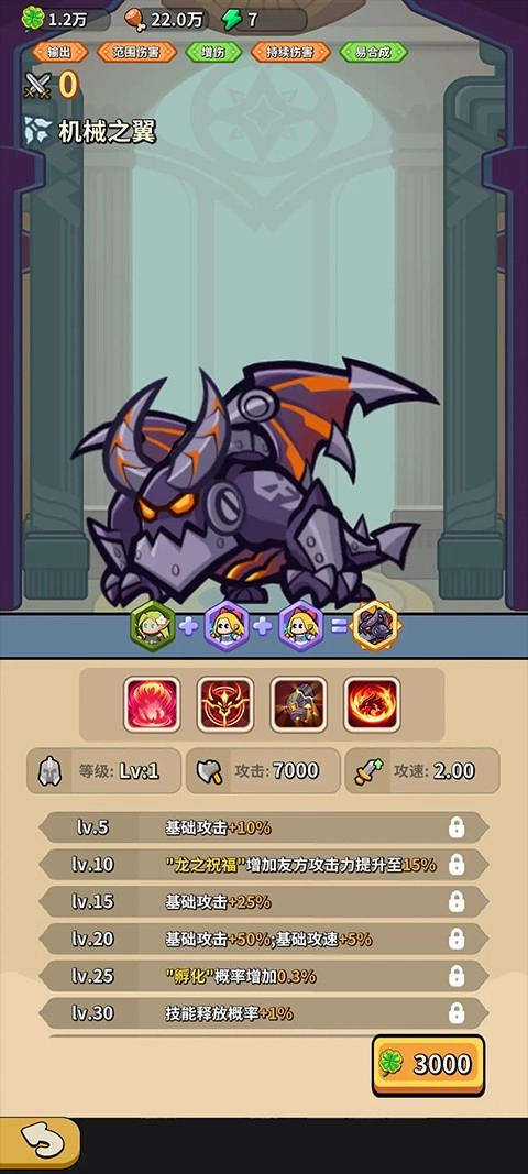 注意!(带控制技能的英雄最好别放在门口,推荐放到1-3/1-4位置),避免BOSS卡在门口导致错过最佳击杀时机。另外这个游戏不支持叠伤机制,所以机械之翼不能像领主里的龙那样做多个来叠加伤害。