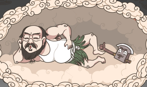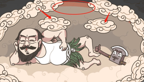 进入游戏后,能看到盘古正睡在一个云团般的蛋壳里,脚边还放着一把斧头,那便是开天辟地的工具。