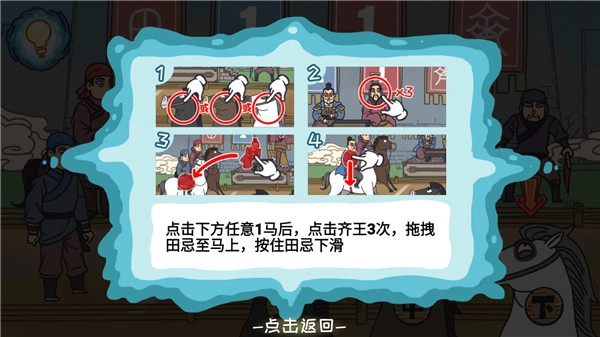 点击下方任意一匹马后,连续点击齐王三次,接着把田忌拖拽到马背上,然后按住田忌向下滑动就可以了。