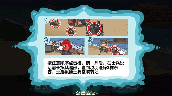 先按任意顺序点击樽、碗、鼎这三样物品,接着在士兵开口说话之前,长按其嘴部位置,一直保持到项羽把这三样东西都砸碎为止。最后将士兵拖拽到项羽所在的位置,就能完成关卡了。