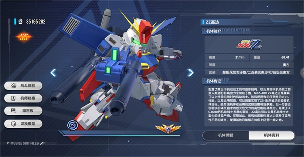 剩下的2个后排位置,我们可以用初期赠送的【暴风高达】或者第二天登录就能获取的【ZZ高达】来填补,以此弥补队伍缺乏回复手段的短板。