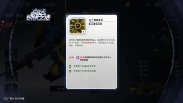 以自由高达为例,它的主动技能【全炮门发射】在攻击处于“燃烧状态”的敌人时,能得到额外的伤害加成(这需要通过研发机体并提升星级来解锁)。要是目标被这个技能直接击坠(也就是耐久值降到零),自由高达就可以恢复100点能量。