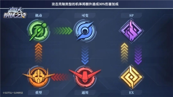 机体类型共有6种,彼此间存在克制关系,例如机动克制可变,可变克制通用,同时上阵特定类型的组合还能激活额外加成。
