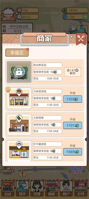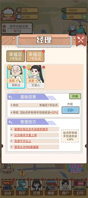 3、每个骑士都有不同的属性,不过通过灵活升级,就能提升他们送外卖的效率,从而确保准时送餐。