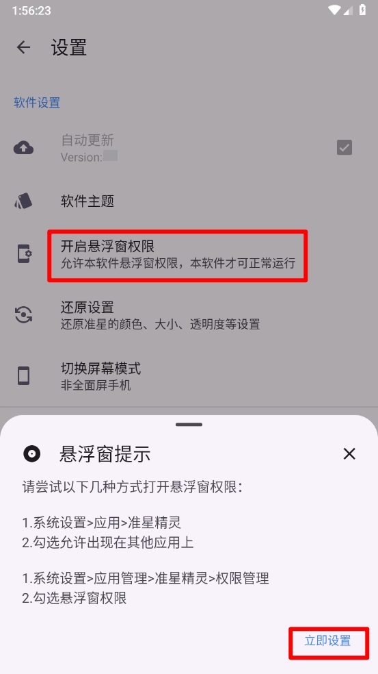 4、最后还能进入设置页面,点击“开启悬浮窗权限”,待弹出提示框后,点击“立即设置”进入并开启即可。