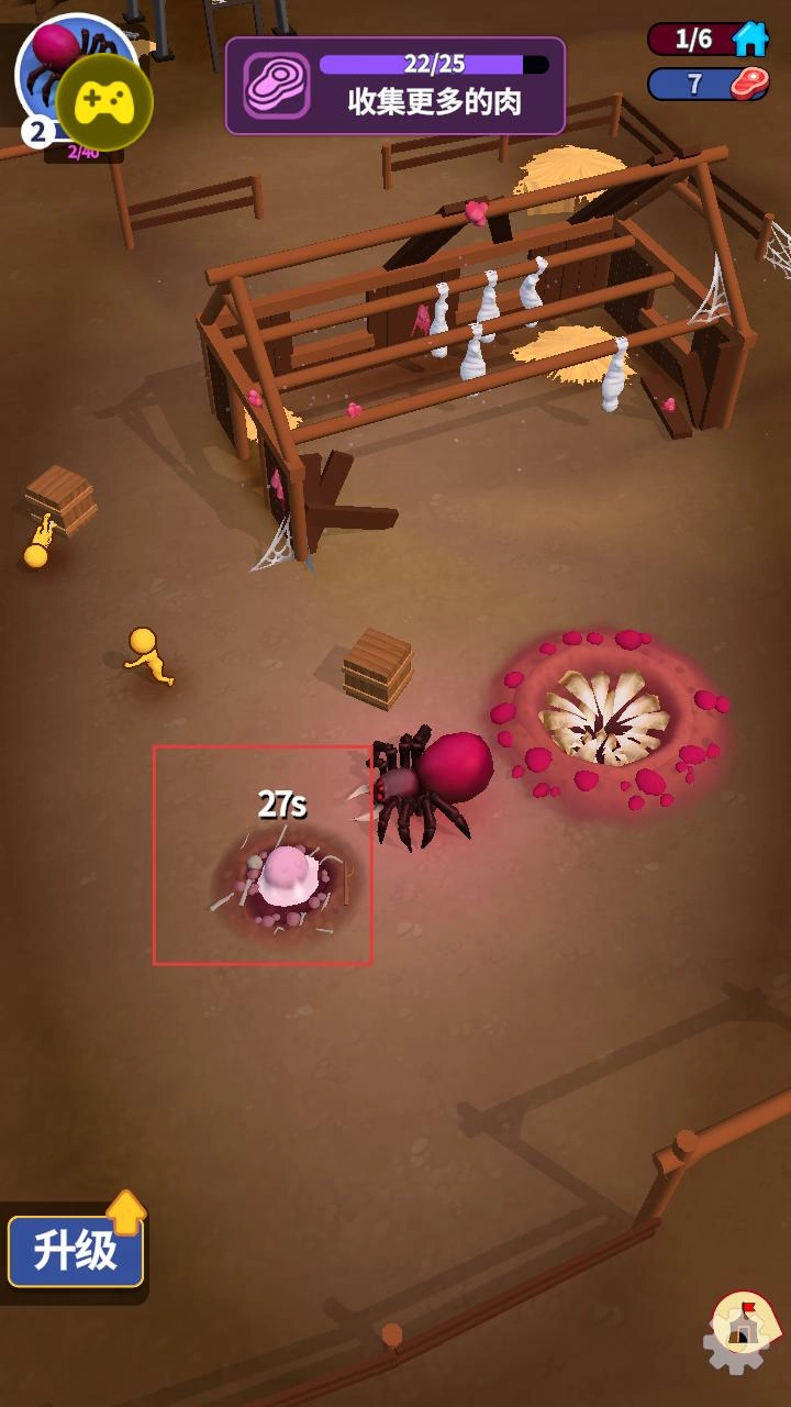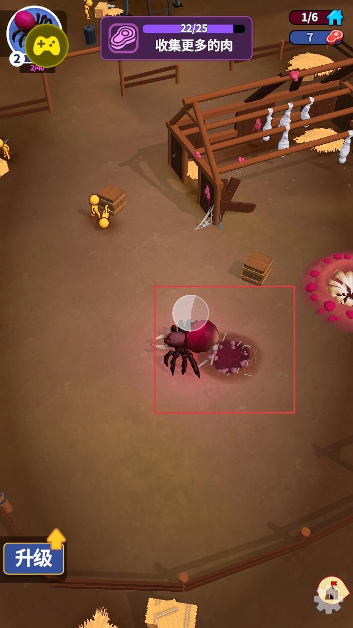 你需要操控蜘蛛在场景里移动,目标是收集尽可能多的肉。界面会实时展示收集进度,另外别忘了关注升级按钮,这样能为蜘蛛之后的成长储备资源。
