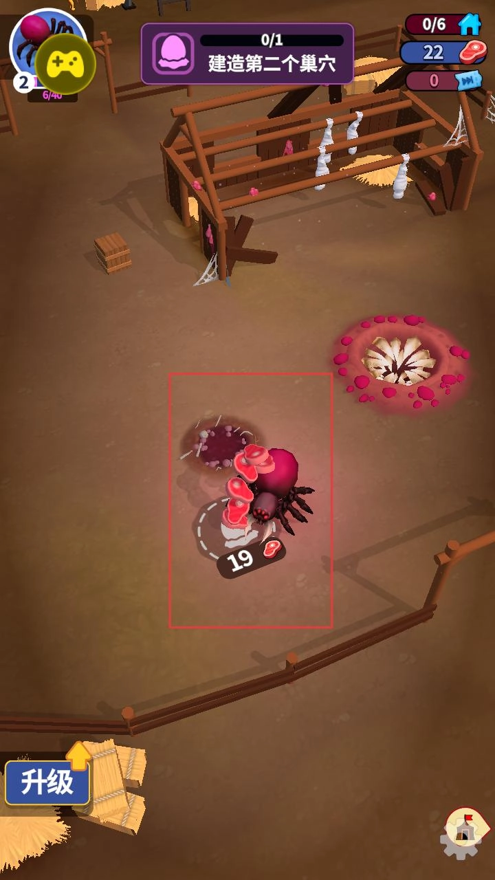 收集肉类资源时,界面会实时显示已收集的数量,当积攒到足够的肉后,就能用来建造第二个巢穴,以此逐步拓展蜘蛛的生存与发展空间。