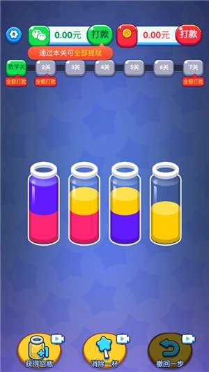 游戏里关卡数量不少,完全可以直接去尝试挑战。只要把相同颜色的水倒入同一个瓶子里,就能轻松消除,通关自然也不在话下。