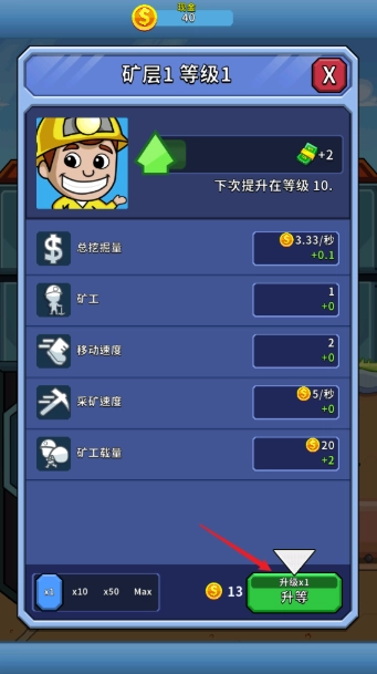4、有了收入之后就可以升级矿工,提升他们的工作效率。