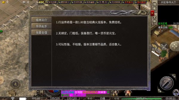 1、行运传奇是一款1.80复古经典火龙版本的游戏,支持免费挂机功能。