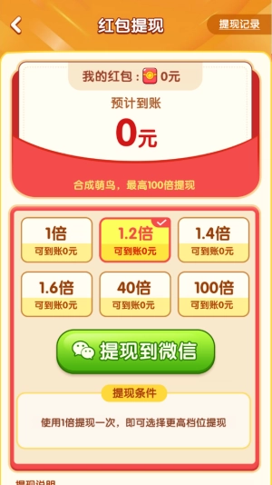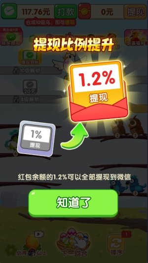 9、除了关卡提现外,还能将积累的红包按照比例提现,比例可以通过合成高等级小鸟来提升。