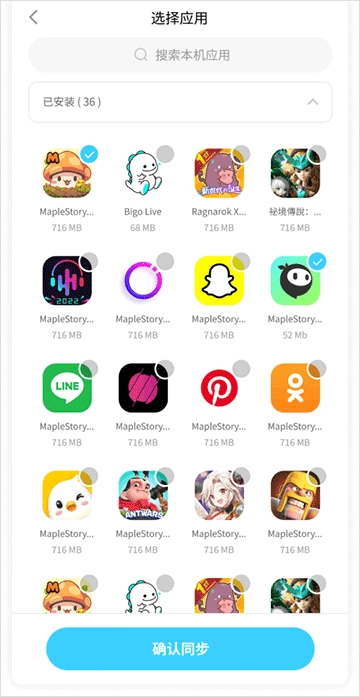 4、在选择应用页面选择需要同步到模拟器的游戏和应用,点击“确认同步”即可
