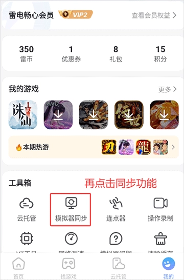 3、然后再次打开雷电圈,在我的的界面点击“模拟器同步”