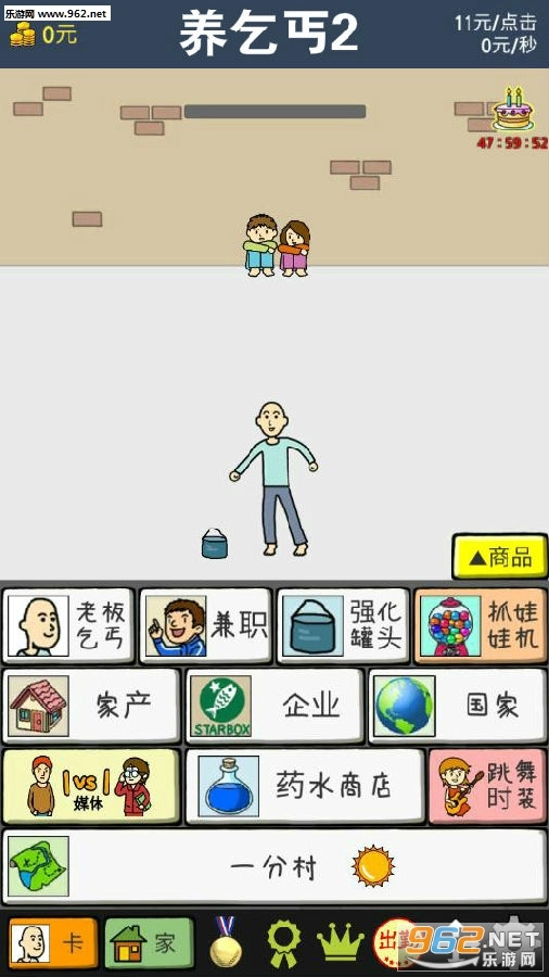 《养乞丐2一分村》是一款趣味十足的小游戏,玩家在游戏里扮演丐帮成员,自身穷困潦倒却要抚养两个孩子。为了凑齐孩子的奶粉钱,你得努力打拼。起初收入或许微薄,但可以用金币提升点击能力,以此赚取更多金币。等金币积累到一定数额,开公司之类的都不在话下,从乞丐逆袭为商业巨子并非空谈。